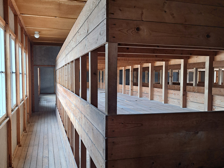 Danach überquerten wir den Appellplatz und betraten eine nachgebaute Baracke. Dort erklärte uns unser Guide, unter welchen Umständen die Gefangenen geschlafen und gelebt hatten. Wir sahen die Betten, die Toiletten, die Waschtröge und den Aufenthaltsraum. Anschließend gingen wir die Allee entlang in Richtung eines der Wachtürme, von denen aus das KZ ursprünglich überwacht worden war. Dort erklärte der Guide, dass SS-Männer die Kappen der Gefangenen absichtlich ins Gras warfen, um sie zu quälen.