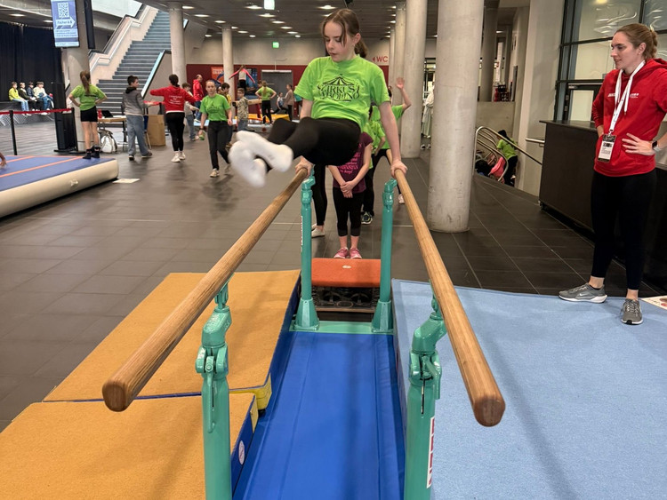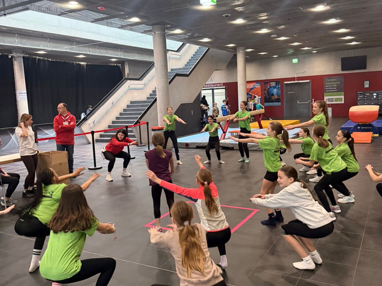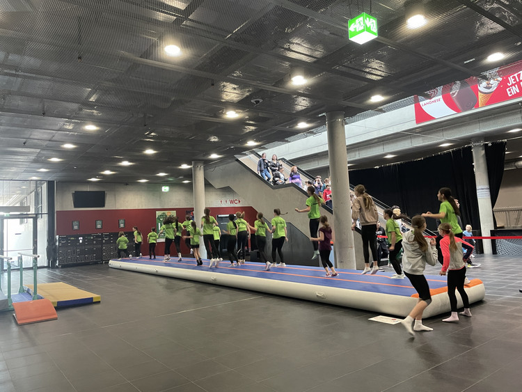 Der Tag begann mit einem abwechslungsreichen Schulaktionstag, bei dem die Kinder selbst aktiv werden konnten. An verschiedenen Stationen – darunter Barren, Schwebebalken, Sprungbrett und Turnmatte – hatten sie die Möglichkeit, ihre turnerischen Fähigkeiten auszuprobieren und zu trainieren.