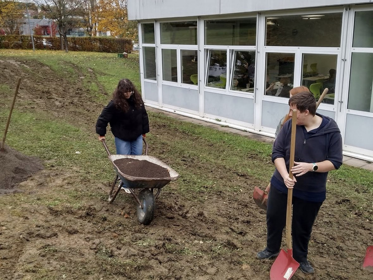 An der Realschule Bonlanden wurde in dieser Woche gemeinsam mit dem Klimaschutzmanager der Stadt Filderstadt, Herrn Dr. Schwarz, und Frau Schrade vom Tiefbauamt (Abteilung Grünflächen) kräftig angepackt: