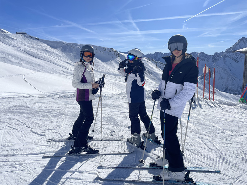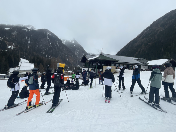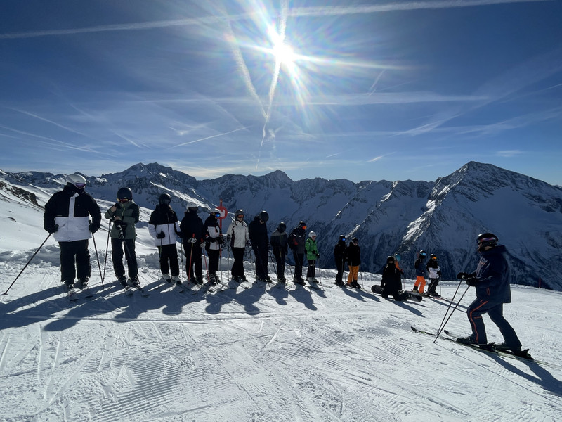 Nachdem wir am nächsten Morgen gefrühstückt hatten, ging es auch schon los ins Skigebiet. Bei einem kurzen Zwischenstopp wurde das noch fehlende Ski- und Snowboard-Equipment ausgeliehen. Angekommen im Skigebiet schnallten wir unsere Skier oder Snowboards an und teilten uns in verschiedene Gruppen auf. Die Anfänger übten an einem kleinen Hang an der Talstation, während die Fortgeschrittenen auf dem Berg durchstarteten.